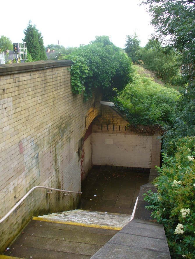 A view of the bricked up subway and the replacement exit off to the right. © Chris Bruce 2017