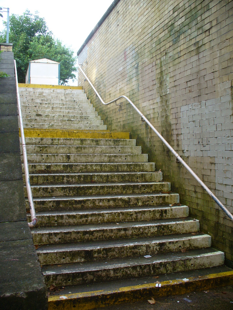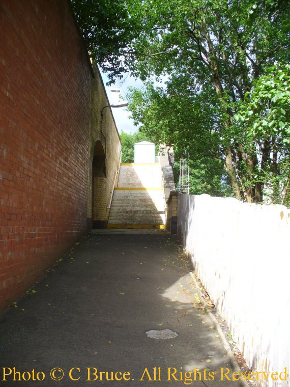 A view down the steps from teh Oldham bound platform. Passenger would have gone left under the track and into the station booking office. © Chris Bruce 2017