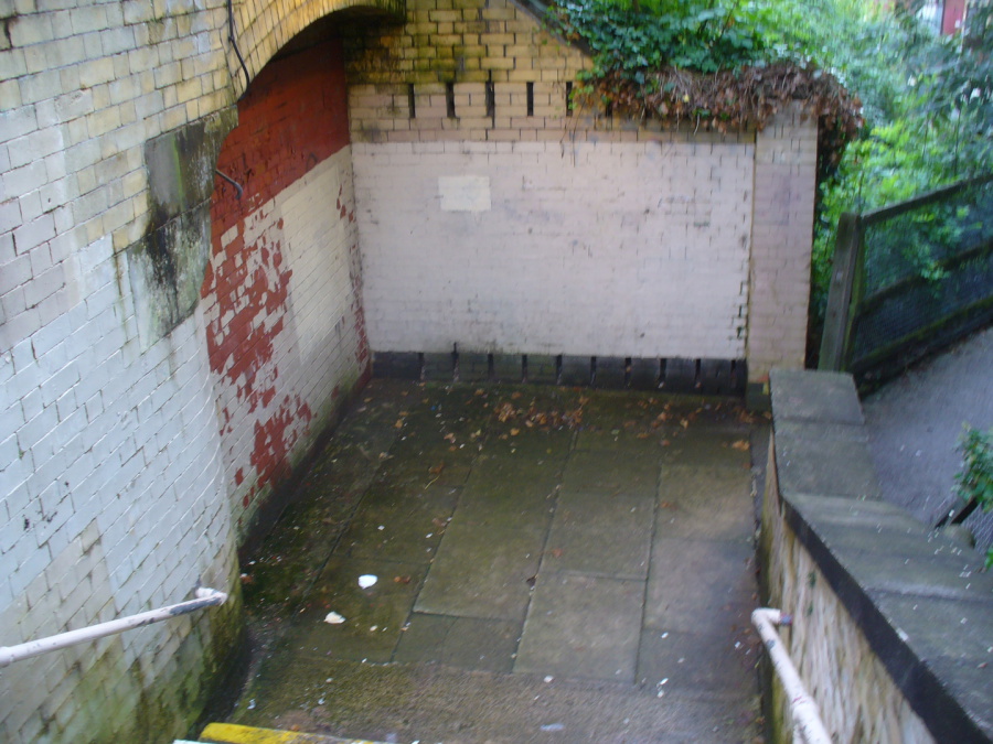 The access to the Manchester bound platform. On the left is the bricked up subway to the Oldham platform. © Chris Bruce 2017