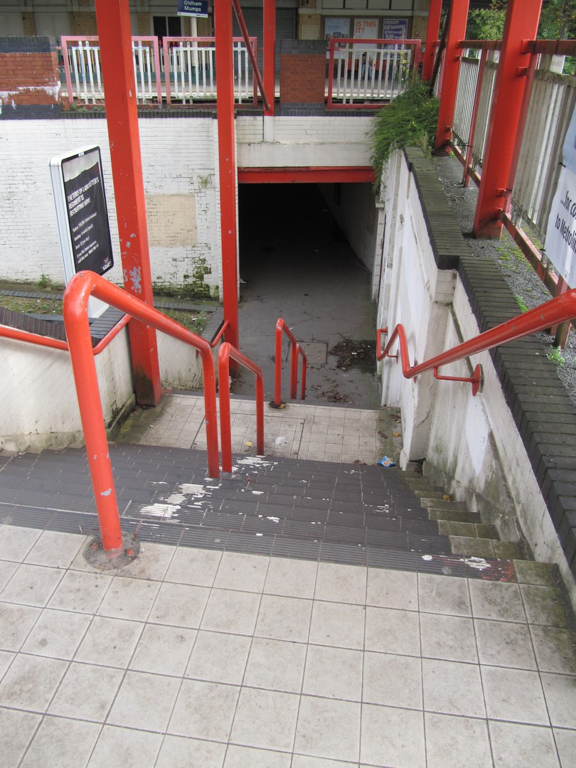 The way in to Oldham Mumps railway station. As seen in May 2018. Copyright Chris Bruce 2018