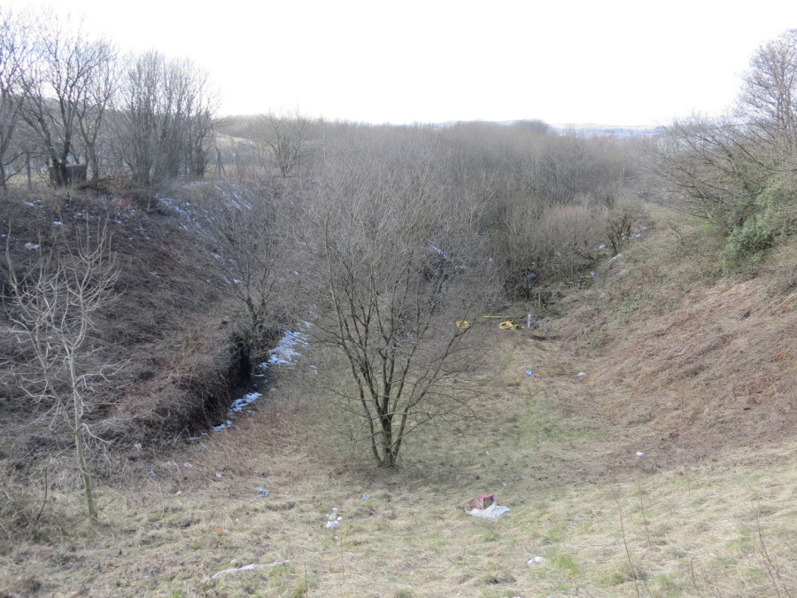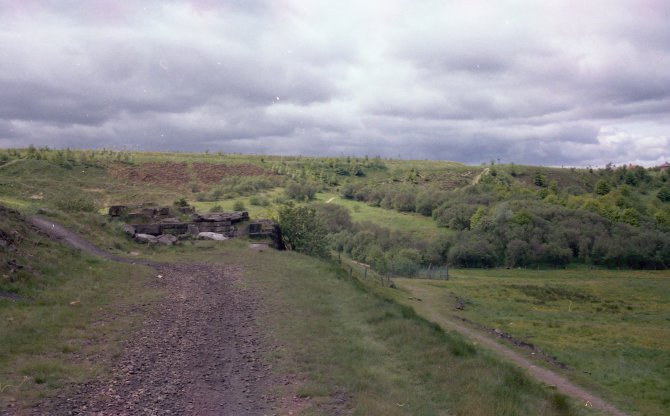 The view from Higginshaw Lane looking towards Turf Lane and Royton. The incline to Higginshaw Gas Works can be seen on the left hand side. The bridge over Higginshaw Lane was filled in in the late