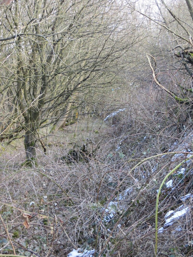 Looking back down the incline towards Higginshaw Lane. The undergrowth tries its best to hide all traces of the line. Copyright and all rights reserved Chris Bruce 2017.