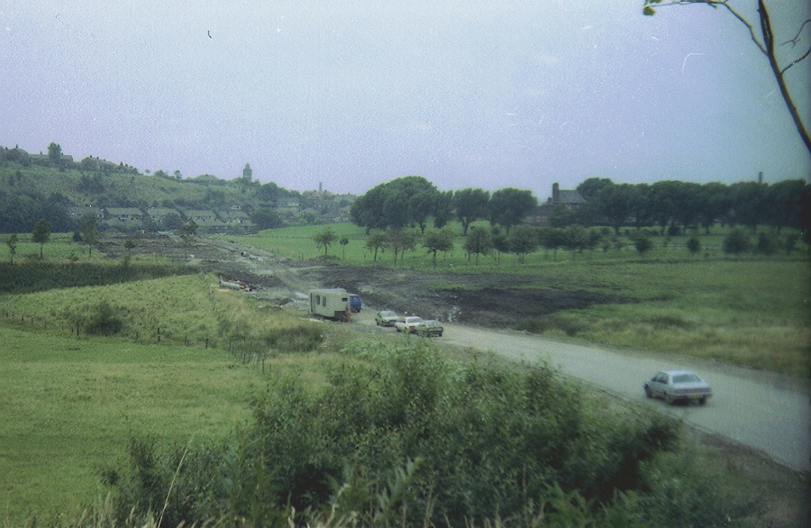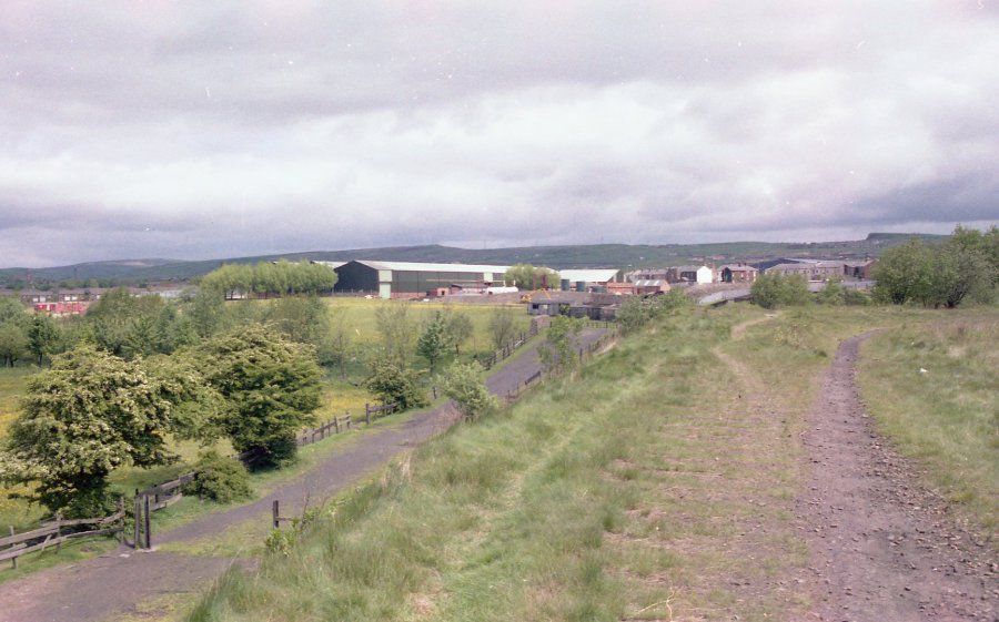 With Royton Junction to the left and Royton to the right, the branch is being cut through by Slamon Fields road for the new industrial estate. This view is taken in the mid 1980's. Copyright