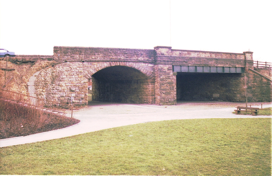 Shaw Road bridges over the station throat for Royton. These have now been filled in apart from a footpath through the right hand span. Copyright and all rights reserved Chris Bruce 2017.
