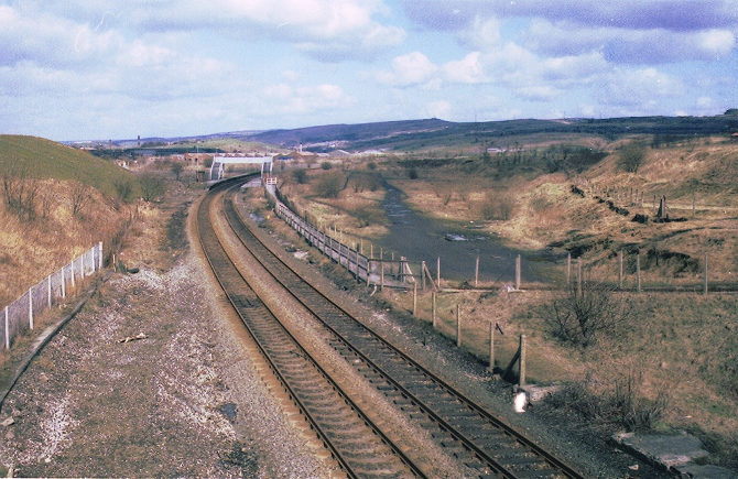 Royton (Junction) viewed from Holyrood Street bridge in 1988. The Royton branch went off to the left and the main sorting sidings were on the right. Copyright Chris Bruce 2017