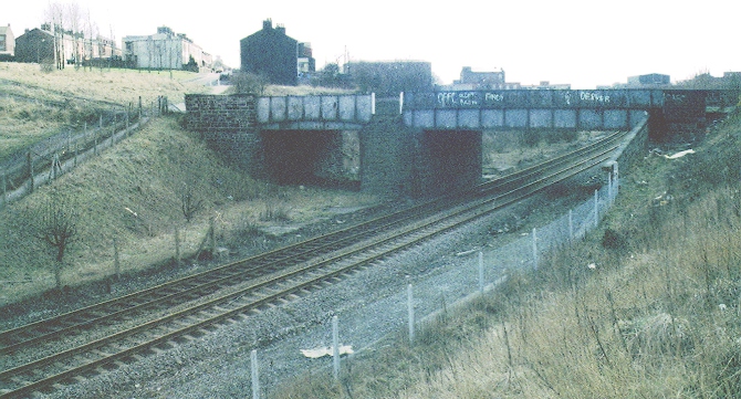 Holyrood Street bridge in 1988. Access to the Oldham & Manchester bound platforms was by the footbridge on the left of the bridge. Copyright Chris Bruce 2017