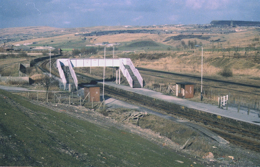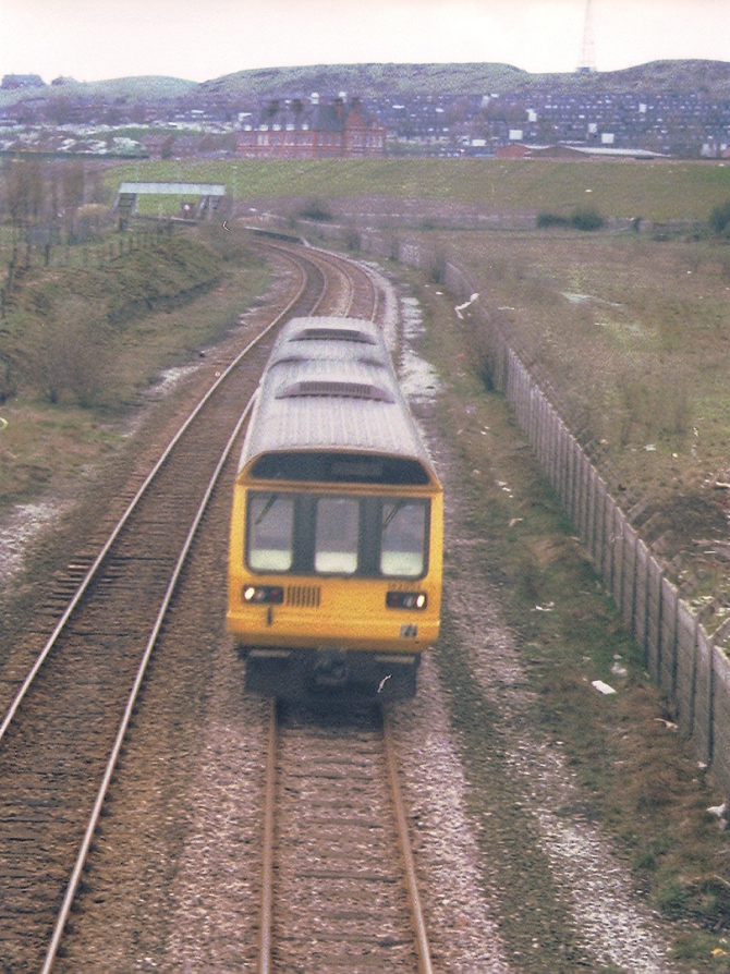 Royton (Junction) station in 1987. The branch to Royton, now filled in, curved off to the left and the sorting yard was still visible before the trees suddenly took over in the