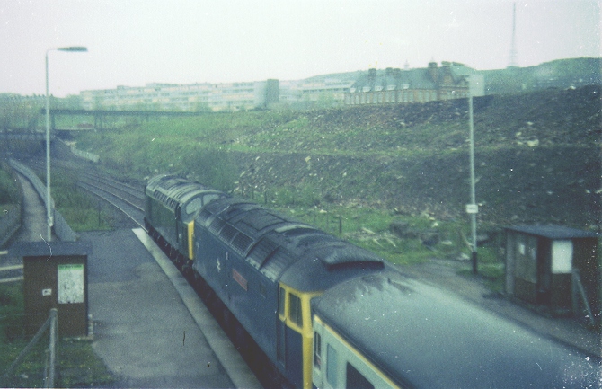 40122 + 47555 head through Rotyon Junction heading for Oldham Mumps. this railtour was supposed to feature 40122 with green liveried 47484, but 47484 was borrowed on route to the