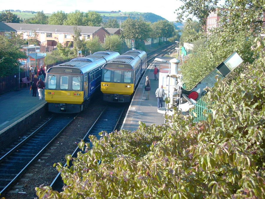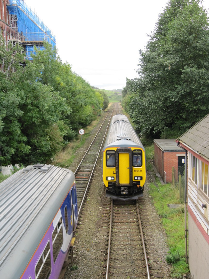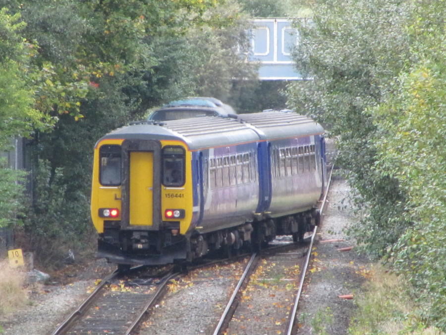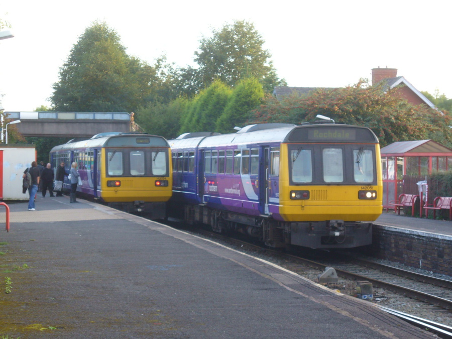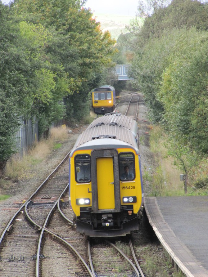 156428 enters Shaw & Crompton from Rochdale while a 142 waits in the turn back siding. Copyright and all rights reserved Chris Bruce 2017.